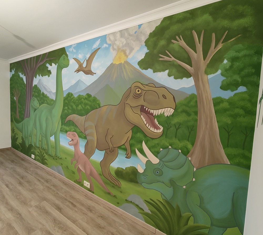 De muurschildering toont een landschap waarin verschillende dinosaurussen samenleven: groot en klein, rustig en nieuwsgierig. Geen angstaanjagende scènes, maar een warme fantasiewereld waarin een kind kan dromen, spelen en zich veilig voelen.