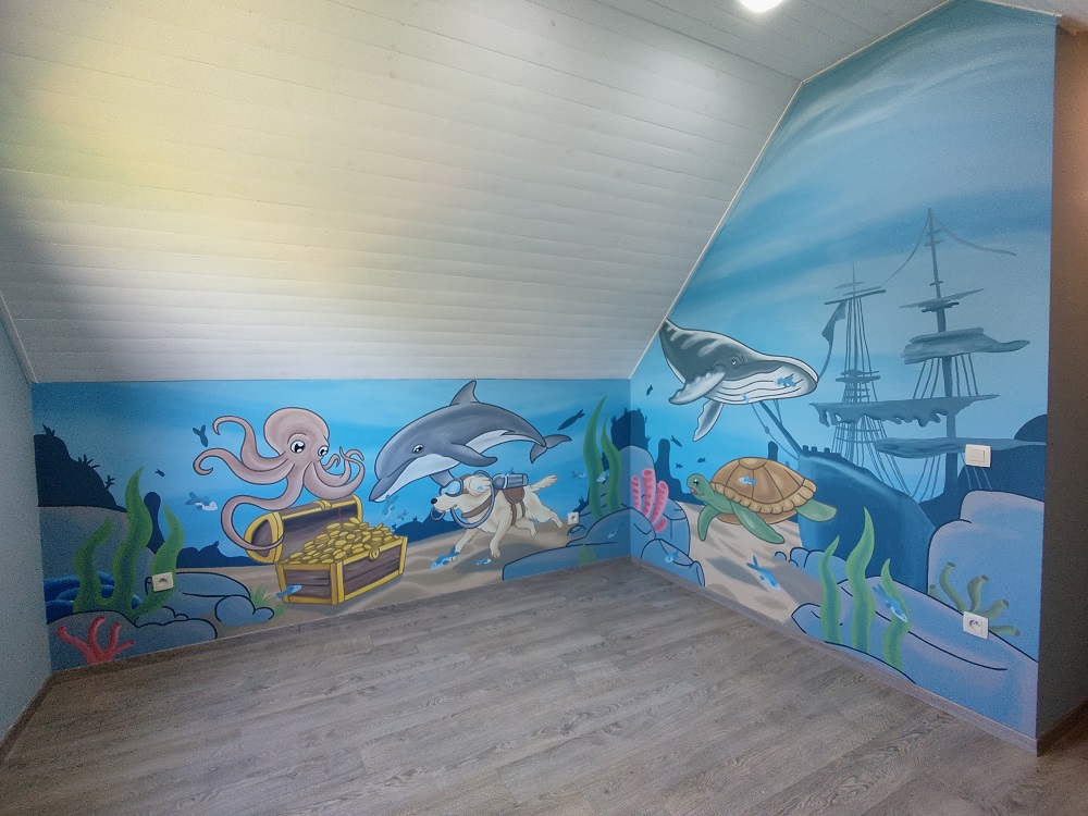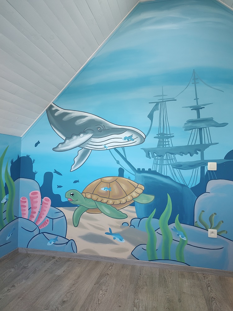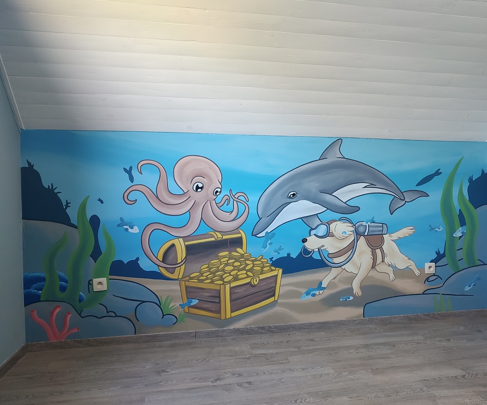 Vanaf het eerste penseelstreek was het duidelijk dat deze muur meer mocht worden dan enkel decoratie. Ik wilde een plek creëren waar een kind kan dromen, ontdekken en verhalen verzinnen. Zo ontstond een speelse oceaan met dolfijnen, een rustige walvis, een nieuwsgierige schildpad en een vrolijke octopus die een schatkist bewaakt. Zelfs een dappere hondenduiker kreeg een plek in dit verhaal, klaar om samen met de kijker op ontdekking te gaan.